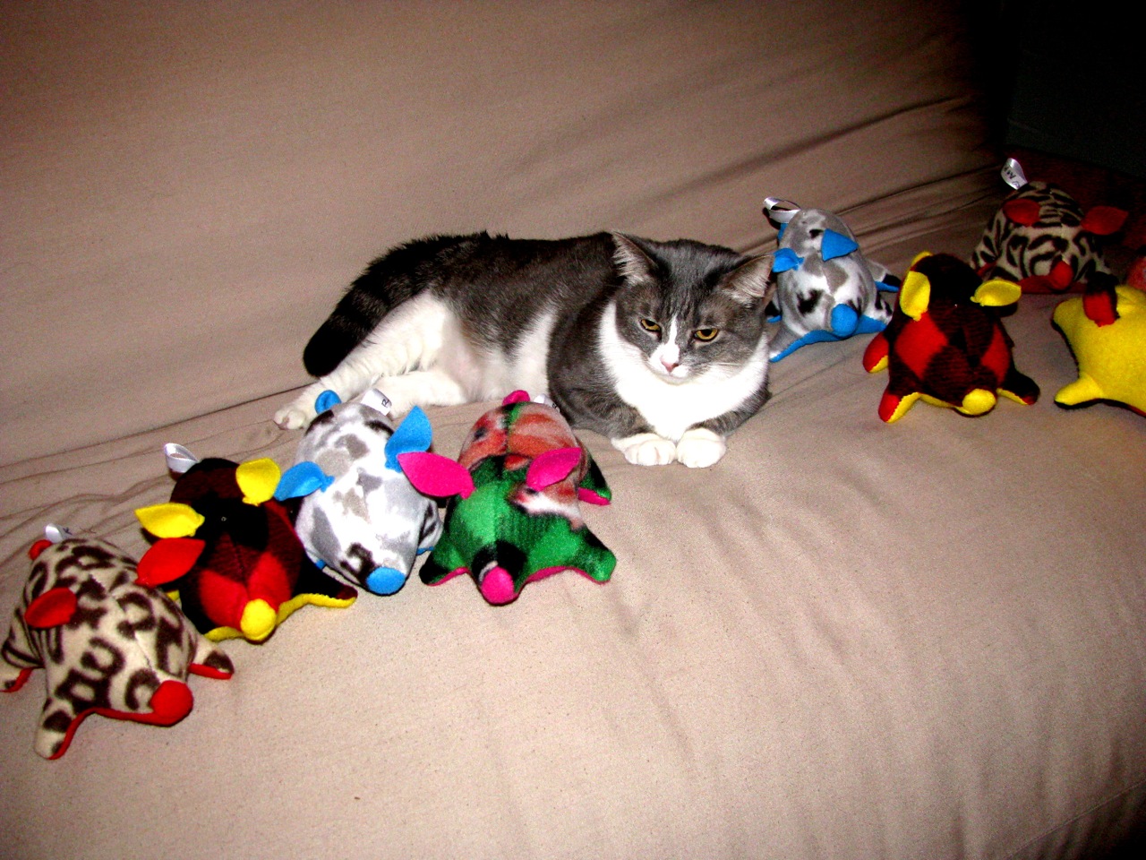 Here in our little home, we’ve also been trying to work in more thrifty DIY projects. Going out on a limb last year, we typed into our Google browser: “what to give everyone for Christmas,” and the Internet gave us this brilliant gift: a pattern for Martha Stewart felted pigs. Amazing!! And so we joined the throng at Hancock Fabrics on Black Friday, picking out our assortment of colorful patterned fleeces: Hot-pink! Giraffe-print! Horse-heads! Camo! Plaid! We had never sewed anything before in our lives. But over the next four weeks, interspersed with term-papers and highway travel, we brought 16 little piggies into fruition. We also drank a lot of wine and watched sooo many episodes of Buffy the Vampire Slayer. It was a perfect storm.
