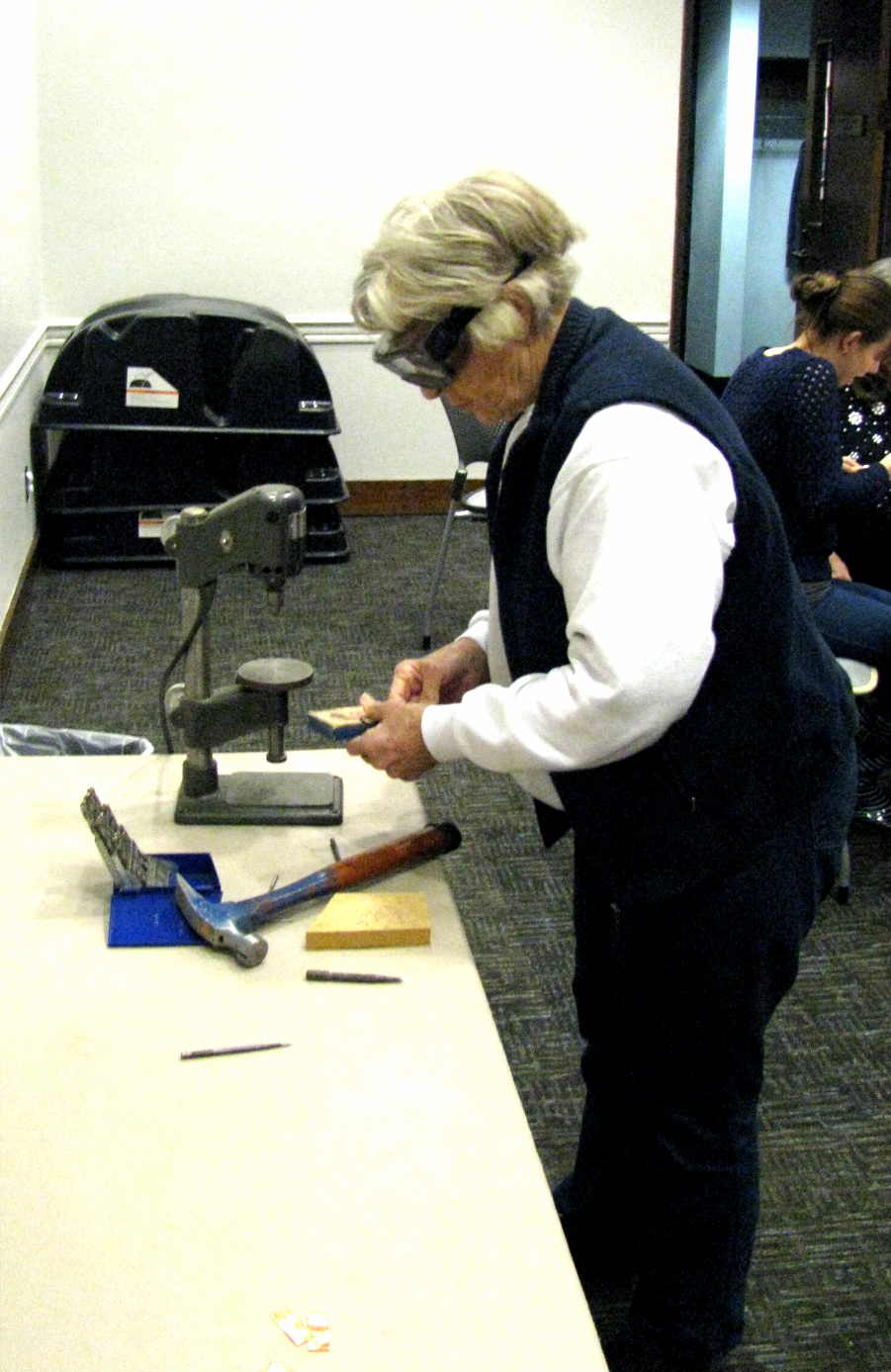 This was our most diverse group yet, with teenage twin sisters, fathers and sons, little old ladies who were best friends. We worked with some cool tools, including this crazy hole punch contraption. Don’t forget your goggles, ladies!