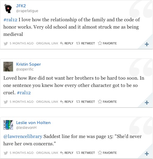 But I think my very favorite is from this fall, when I had the opportunity to moderate a Twitter book chat for my library’s Read Across Lawrence pick, Winter’s Bone.