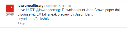A few weeks ago, Lawrence Magazine sent out a tweet with a link to download your own John Brown paper doll and disguise kit. This tweet showed up in our @lawrencelibrary feed, and we loved it. We often retweet Items of Cultural Importance, which is exactly what we did with the John Brown Paper Doll tweet:
