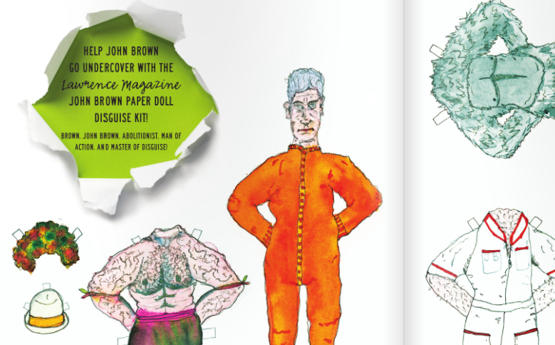In short, this initiated a dialogue between Lawrence Magazine, Lawrence Public Library, and the artist Jason Barr, which ultimately led to a John Brown Paper Doll giveaway that we’re doing in conjunction with three Civil War events at the library next week. Even better? We’ve produced a giant version of the paper doll, cut out & with velcro, that is now an interactive, hands-on display in our lobby that celebrates and curates our local history. Win win win win win.